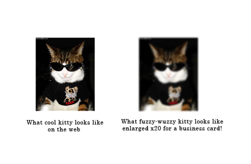 Ha! Cat-with-shades is a beaut! But it would be bad to use this tiny image on your business card. Find a nice big cat-with-shades image to use instead! After a quick search I just found this terrific stock image of a clever cat-in-glasses to use for print – http://www.dreamstime.com/stock-photos-kitty-reading-book-image22804503 (although you’ll have to pay for it)